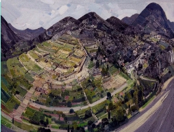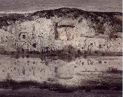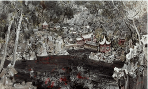 除此之外,“出世”的态度还需依托“入世”的历史情结得到显现,此种经过岁月洗礼的古建筑遗迹在朱沙的绘画中成为了与山石树木一样值得崇敬的风景。画者将废墟情结贯穿于时间绵延的古迹中,获得了福西永意义上的流变性与可塑性:“历史是早熟的事物、现时的事物或迟到的事物之间的冲突。”[1]原本具象的巴蜀风光在时间王国的形式组合中试图超越丹纳宣称的种族、时代和环境的外部神话,指向一种视域的融合。