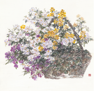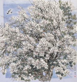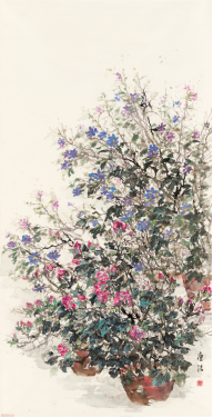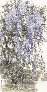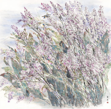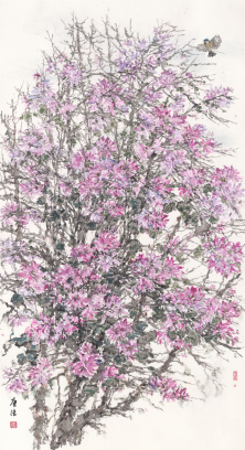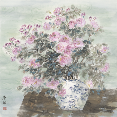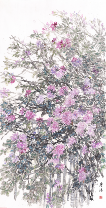 唐洁画花鸟,的确没有使用现成的技法。一般来说,她是用小写意的点垛──亦称“点簇”──之法,按照花卉的自然形态,取其大形,而不执着于花卉的精致而确定的形态,随意点定,或干或枝,或花或叶,或粗或细,或工或写,这种造型手法吸收了水彩画花卉写生画法,直接以点染构形,即使有一二勾勒之处,亦不在意花之形色。当然该勾筋勾筋,该点叶点叶,再加上撞水撞粉在点垛的彩墨块上形成的自然肌理,画面斑驳陆离,使唐洁的小写意彩墨画法生出许多变幻莫测的偶然笔墨效果。这种偶然随机,工写兼之,而又非特定之大写意小写意乃至没骨的画法显然不同于中国画花鸟技法中任何一类常规画法,这是唐洁画法给人一种全新印象的原因。应该说,探索到一种全新的画法,已经是很不容易的事情。她的这种创造性的画法,显然是她初出茅庐就能参加全国美展的重要原因。