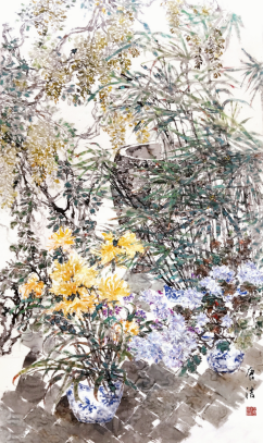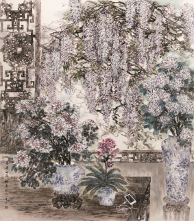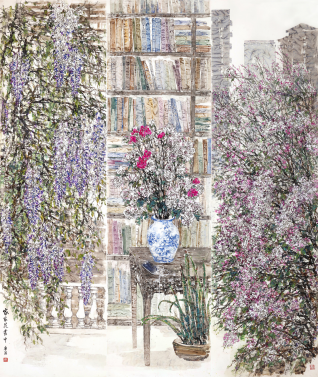 唐洁的画有着一望而知的新颖独特性。她的画法显然是写意画法,用笔或大,或小,或阔或窄,轻松自然,随意点染,不拘一格,但又决非大写意画法;似乎近似于小写意,但也不全是,许多地方又好像是工笔;你看那雕花木窗,雕花木方桌,那方直刚劲的轮廓与任何写意都不沾边;但你真要认为这是工笔,画面中又找不到一根工笔画的线条,唐洁用的几乎全是没骨技法;但你认为这就是没骨法,没骨法一般又比较偏工,而唐洁的画法明明是在写,在随意点染……看来这是唐洁揉工笔,写意,没骨彩墨画法于一体的独具个人特色的花鸟画法。加上这幅画画面幅面颇大,全画把室外大架紫藤,室内数盆青花瓷盆花卉,连同古色古香的雕花窗框,木桌一并置诸于画面,结构饱满,春花烁烁,取得一种置花卉于场景且古雅盎然的意趣。桌面上还摆了一个带着充电线的手机,一种年轻的富于鲜明时代感的标志,使唐洁这幅中国画的花卉画在独特的中国式古雅场景中又生出几许现代生活中的亲切。画法的独树一帜,境界的文静古雅,使初出茅庐的年轻画家以此画一举而冲至全国美展,唐洁开始为全国画坛所知晓。看来唐洁这画法的确非常独特,十二届全国美展过去几年之后,唐洁这种新颖的国画花卉的画法,仍然使人们觉得新奇,她的大型作品《家家花丛中》又参加了十三届全国美展四川省展。这幅画仍然是《春华缤纷》,仍然是她那种随意点定,天然灵动而又有几分斑驳陆离的画法。所画花卉仍然置于一定的场景之中,只是这一次画面属三连屏的拼置,把书斋花盆,阳台紫藤,与城市环境中的行道花树并置一画,中间书斋桌子上,仍然放着那个标志性的带着充电线的手机,好像这是唐洁在她那独一无二风格作品上的签名。